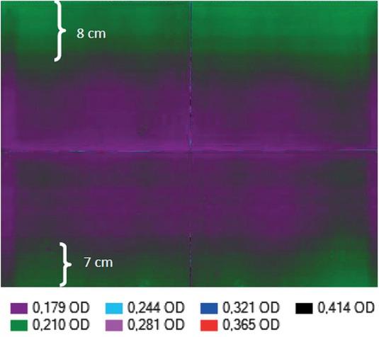 The homogeneity map of the scanner can be seen in Figure 1. Based on these results, it can be observed that the top 8 cm and the bottom 7 cm borders of the scanner’s sensitive area are inhomogeneous. There are small inhomogeneities on the right and the left part of the scanner bed. For the film evaluation, we can use an approximately 15 cm wide homogeneous area in the centre of the scanner. Inside the homogeneous area the optical density has less than 4% deviation, outside the area it reaches 13%.