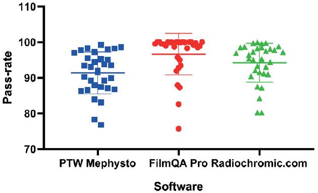 According to statistical analysis, the passing rates for FilmQA Pro were significantly higher than PTW Mephysto and Radiochromic.com.