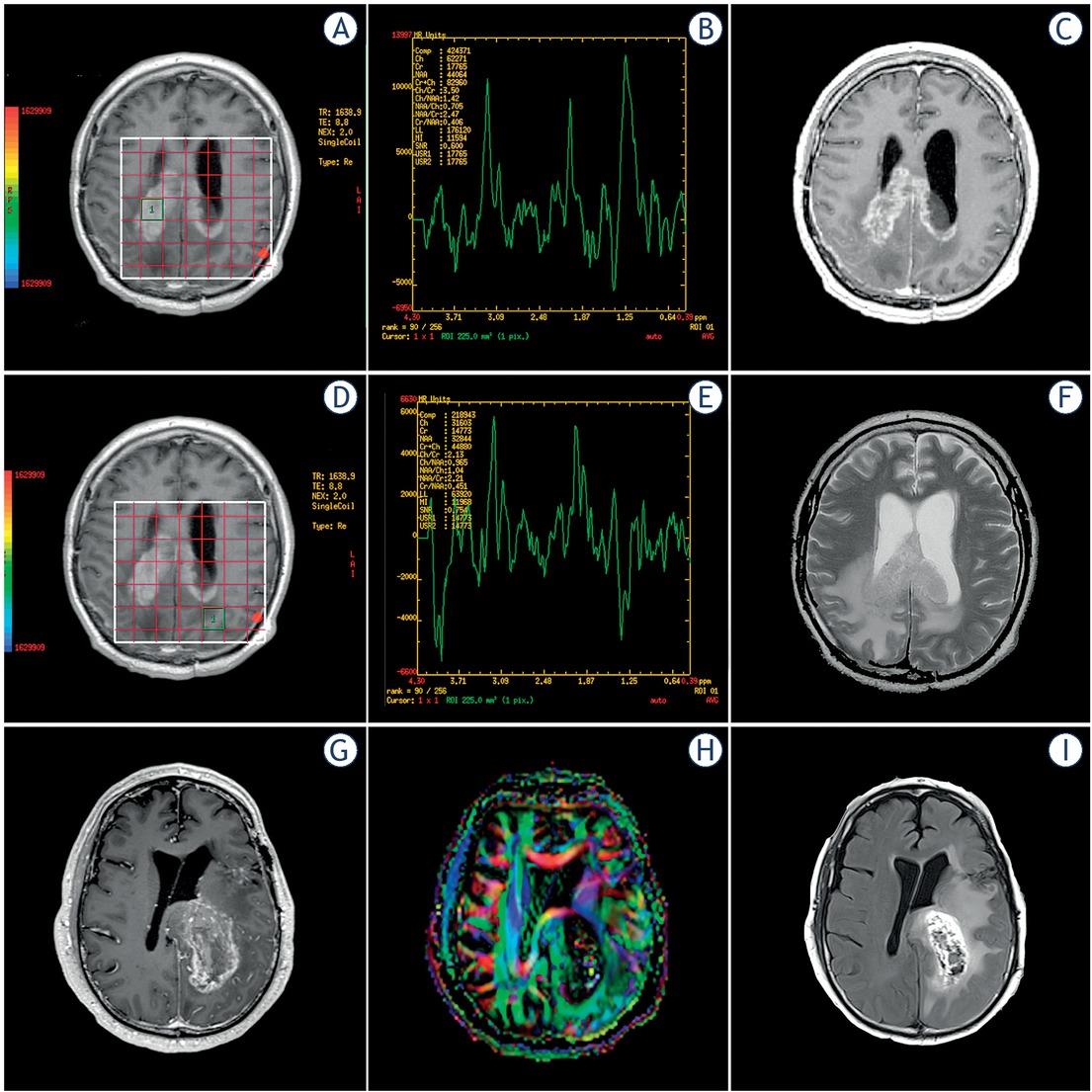 (A-F) magnetic resonance spectroscopy (MRS) measurements at the enhancing rim and peritumoral edema. (G-I) example of a FA map used to locate the ROI at the selected regions: enhancing rim, peritumoral oedema, and normal-appearing white matter (NAWM).