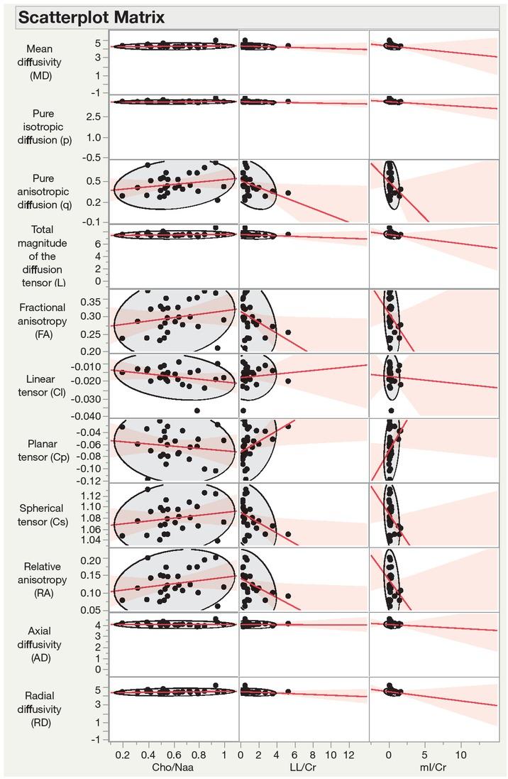 We found five pairs of bivariate correlations showing statistical significance all of them with the same metabolite LL/Cr. Only one correlation was positive, Cp ⇔ LL/Cr, Rs = .468, p = .014. The other four depicted negative Rs coefficients: FA ⇔ LL/Cr, Rs = -.475, p = .012; q ⇔ LL/Cr, Rs = -.495, p = .009; RA ⇔ LL/Cr, Rs = -.490, p = .010; Cs ⇔ LL/Cr, Rs = -.488, p = .010. Table 1 shows the correlations between DTI metrics and MRS metabolites at the NAWM region. Figure 2 depicts a scatterplot matrix of the DTI and MRS correlations at the NAWM region.