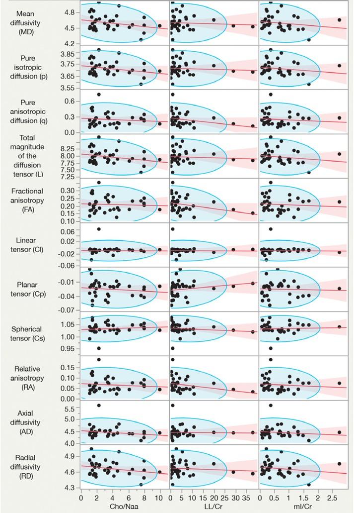 Some limitations need to be acknowledged: we did not use the single-voxel technique that it is favourite in clinical practice (widely available, usually good field homogeneity, can be readily performed at short echo times, and is relatively easy to process and interpret). However, its highest single limitation is the lack of ability to determine the spatial heterogeneity of spectral patterns and the fact that only a small number of brain regions can be covered within the time constraints of a routine clinical MR exam.45 We did not measure metabolite relaxation rates due to scan-time limitations related to a large number of voxels under investigation. We were not able to calculate concentrations of additional metabolites such as glutamine, glutamate, alanine, amino acids, separation of lipids and lactate; they required special software packages ready to fit short-echo and long-echo spectra, such as LCModel 46 and jMRU I47; these were not available at our institution when the MRS data for this project were acquired. We would have liked to obtain a higher number of directional motion-probing gradients (MPG) like other studies reporting up to 40- and 81- for the DTI acquisition.48 It is known that the minimal mathematic requirement for DTI-parameters calculation is 6 independent directional MPG settings.48 Because the amount of imaging time is limited in most clinical situations, we followed the recommendations of the MRI scanner vendor. Our choice of 25 MPG settings thus involved a trade-off between minimizing directional bias and minimizing scanning time, it also complied with the minimum of 20 unique sampling orientations necessary for a robust estimation of anisotropy.49