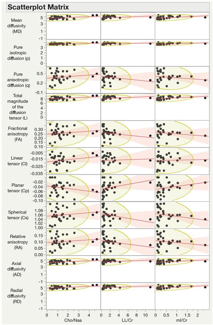 In our fourth and last group of observations, we found ten significant bivariate correlations only observed in that region (AD ⇔ LL/Cr, MD ⇔ LL/ Cr, p ⇔ LL/Cr, RD ⇔ LL/Cr, L ⇔ LL/Cr, AD ⇔ mI/ Cr, MD ⇔ mI/Cr, p ⇔ mI/Cr, RD ⇔ mI/Cr, L ⇔ mI/Cr). All correlations had a positive sign, meaning that any increase in LL/Cr or mI/Cr, will coincide with increases in AD, MD, p, RD and L.