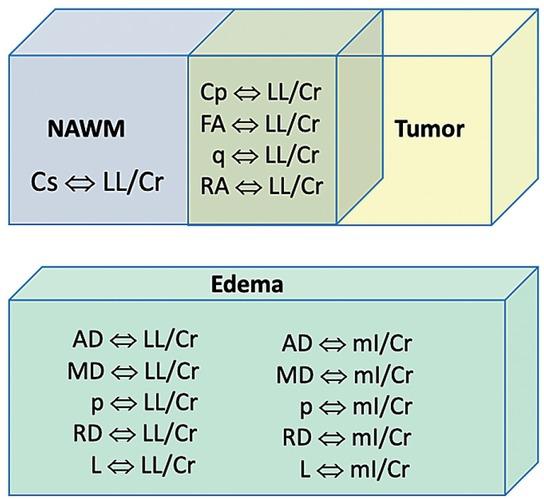 Cs and LL/Cr depicted a negative correlation, meaning the increase or decrease in opposite directions. Cs describes the spherical, geometric properties of the diffusion tensor11; after RA, Cs is the second DTI metric with the best diagnostic performance to characterise the NAWM.13 It is not clear for us why Cs ⇔ LL/Cr, was the only significant correlation observed at the NAWM, but not observed in peritumoral oedema and enhancing rim.