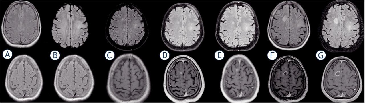 MRI scans in Patient 3 at 0 (A), 465 (B), 742 (C), 790 (D), 811 (E), 825 (F) and 854 (G) days (fluid attenuated inversion recovery [FLAIR] and T1 with gadolinium sequences).