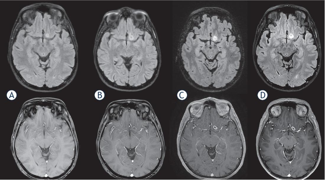 MRI scans in Patient 4 at 0 (A), 160 (B), 196 (C) and 223 (D) days (fluid attenuated inversion recovery [FLAIR] and T1 with gadolinium sequences).