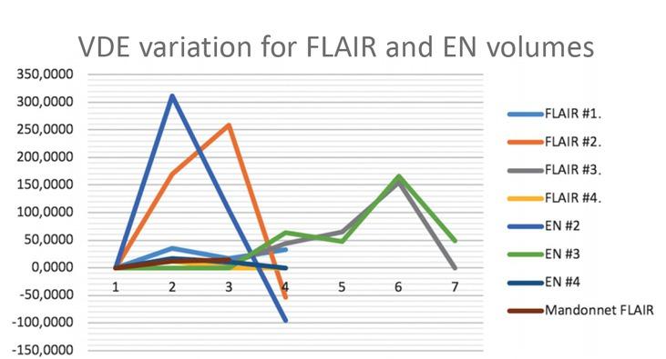 VDE analysis revealed peak in variation along time. Mean percentage maximal VDE/mean VDE ratio, calculated according to eq. 6, was 221.49% and 259.47% for FLAIR and EN volumes, respectively (Table 3).