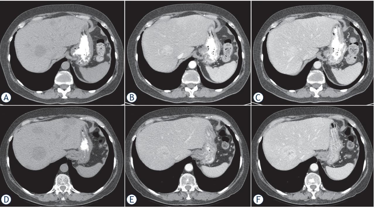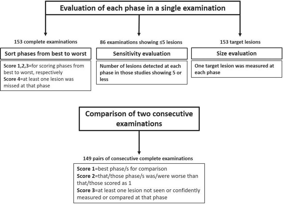 Distribution of scores of each phase for comparing metastatic lesions in two consecutive scans by both readers in 149 examinations