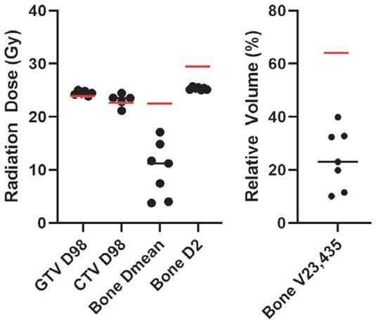 | Circumferential < 40 Gy | Circumferential < 23.7 Gy | Institutional standard | ||