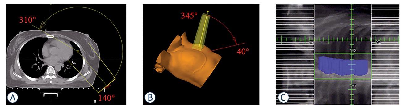 Illustration of the arc angle for coplanar arc (A), non-coplanar arc (B), maximum jaw position for non-coplanar arc (C). (Slate blue, internal mammary nodes planning target volume [PTVimn])