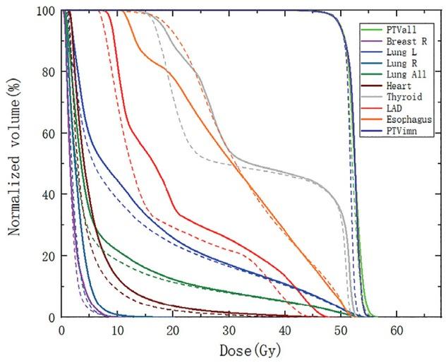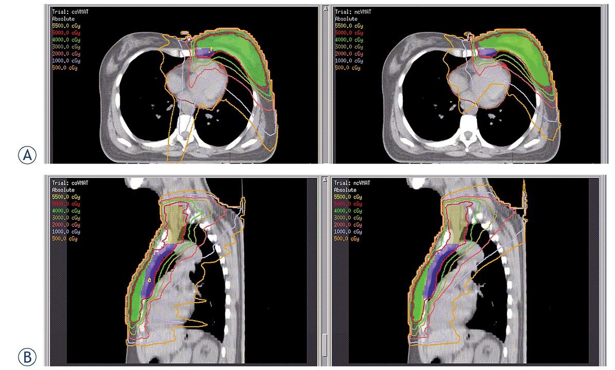Figure 2 shows an example of dose distribution by ncVMAT and coVMAT, demonstrating that the dose lines from 500 cGy to 4000 cGy with ncV-MAT provided better conformity for PTVbreast and PTVimn. A similar difference could also be observed in the dose- volume histogram of PTV and selected OARs (Figure 3). In this particular patient, ncVMAT provided better sparing of the LAD, heart, bilateral lungs, and right breast and better homogeneity for PTVimn.