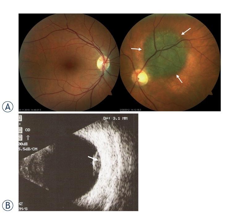 Ocular fundus of a normal eye, and eye with choroidal melanoma. (A) Ocular fundus. Normal healthy eye (left) versus eye with choroidal melanoma (right; dia = 8 mm and thickness = 2.4 mm). (B) Ultrasound image of the choroidal melanoma (thickness = 3.1 mm).