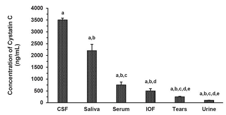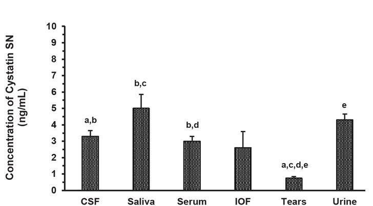 Figure 2 shows the concentration of cystatin C in various biological matrices (cerebral spinal fluid [CSF], saliva, serum, IOF, tears, and urine) in healthy individuals, while Figure 3 depicts the concentration of cystatin SN in these same biological matrices. In general, it was found that the concentration of cystatin C in all the biological matrices significantly exceeded the concentration of cystatin SN in the same matrices (Figure 2 vs. Figure 3). Additionally, the rank order of cystatin C concentrations in the various biological fluids followed the order CSF > saliva > serum > IOF > tears > urine (Figure 2), whereas, for cystatin SN, the rank order was saliva > urine > CSF > serum > IOF > tears (Figure 3).
