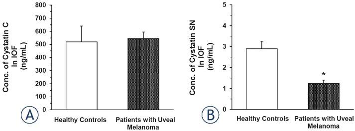 Concentration of cystatin C (A) and cystatin SN (B) in intraocular fluid of patients with uveal melanoma versus healthy controls. (A) Values represent the mean ± standard deviation (s.d.) of n = 7 healthy controls (mean age = 57.5 ± 1.9 years) and n = 18 of 57 total uveal melanoma patients selected based on an age close to the mean age of the 7 healthy controls (mean age = 55.9 ± 3.2 years; n = 18). (B) Values represent the mean ± s.d. of n = 7 healthy controls (mean age = 57.5 ± 1.9 years) and n = 18 of 57 total uveal melanoma patients selected based on an age close to the mean age of the 7 healthy controls (mean age = 55.9 ± 3.2 years; n = 18).