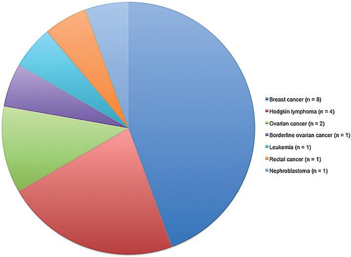 Cancer patients had different types of cancer, but breast cancer was predominant (Figure 1). The average age of cancer patients was 30.3 ± 6.3 years and of women with fertility problems 33.4 ± 5.0 years. The two groups of women did not differ significantly in their age. There was also no significant difference in the age of patients with breast cancer and patients with other cancers (32.0 ± 6.2 vs. 29.0 ± 6.0 years).