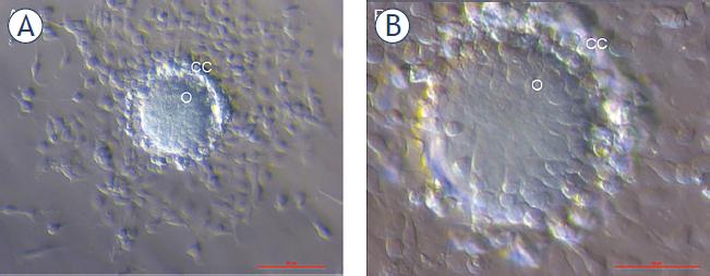 CC = cumulus (granulosa) cells; O = oocyte; Red bar = A) 100 μm in B) 50 μm