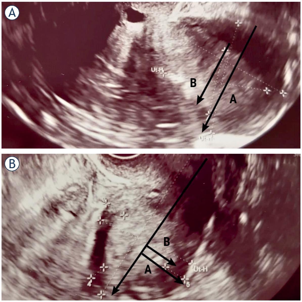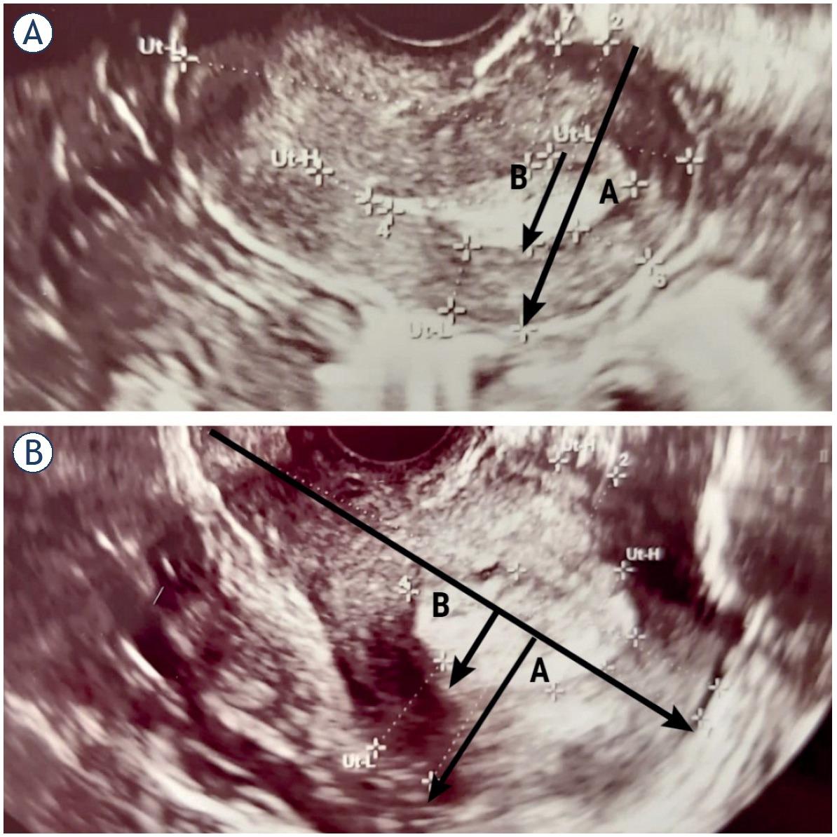 Assessment of myometrial invasion in patients with transvaginal ultrasonography (TVUS). Stage IA endometrial cancer in a 61-year-old postmenopausal woman, correctly diagnosed by TVUS and MRI. Karlsson’s method indicating infiltration of superficial muscle (29%) (A). Stage IA endometrial cancer in a 53-year-old postmenopausal woman. Gordon’s method indicating infiltration of superficial muscle (35%) (B).
