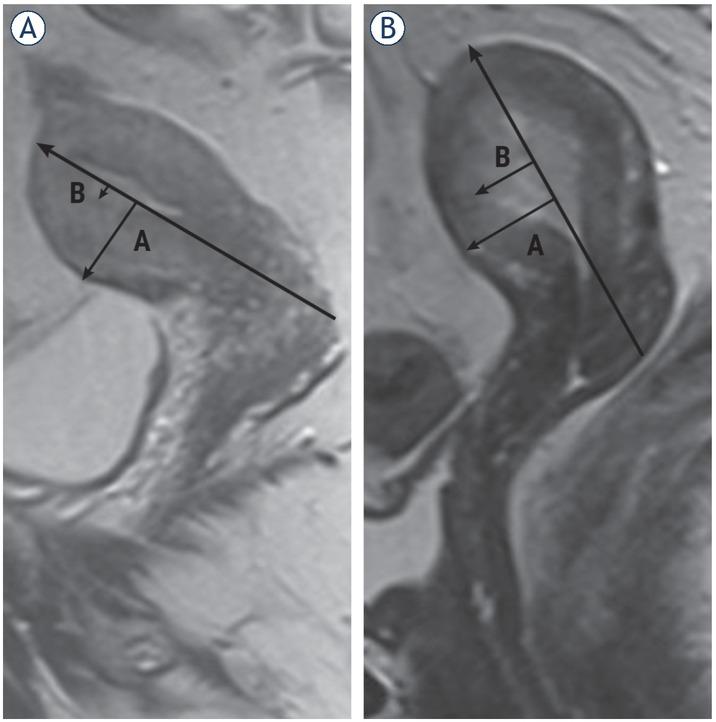 Depth of MI was measured as the ratio between the maximum AP diameter of the endometrial tumor (B) and the uterine AP diameter (A) in sagittal plane, with B/A > 50% indicating deep MI introduced by Karlsson et al. (Figure 1A,Figure 2A).2,5 In other objective method, investigated by Gordon et al., depth of MI was measured as the ratio of the distance between the maximum tumor depth (B) and the total myometrial thickness (A) in sagittal plane, with B/A > 50% indicating deep MI (Figure 1B,Figure 2B).2,5