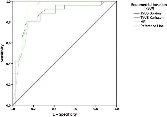 In this prospective, comparative, ultrasonographer-blinded study on patients with EC two objective TVUS methods (Gordon’s and Karlsson’s) and MRI were compared for the MI assessment in the same cohort of patients. All three tested approaches were found to be statistically significant predictors of the MI, exceeding AUC value of 0.85 and reaching final p value < 0.001. We found that MRI assessment of MI is better than any objective TVUS measurement technique in all measures of the diagnostic tests, but without statistically significance.
