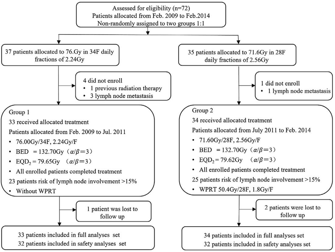 Efficacy analysis was performed by full analysis set (FAS), which consisted of 67 patients who actually received moderate hypo-fractionated radiotherapy. There were three patients lost to follow-up (one in Group-1 and two in Group-2), 64 patients with complete safety data were included in safety set (SS).