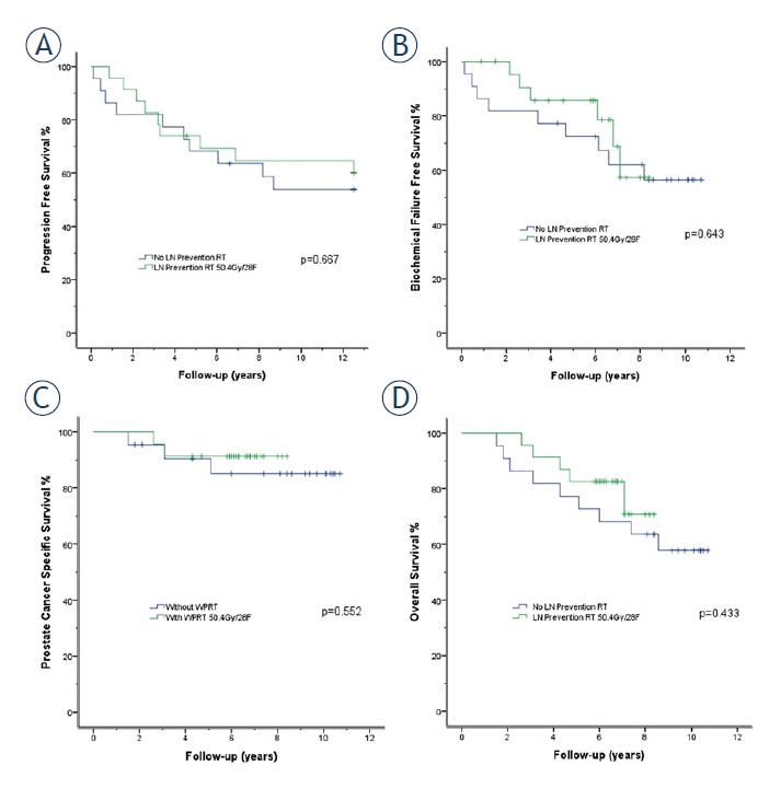 Kaplan-Meier curves of (A) progression-free survival (PFS), (B) biochemical failure free survival (BFFS), (C) prostate cancer specific survival (PCSS), and (D) overall survival (OS) in patients with pelvic lymph nodes involvement (LNI) risk > 15% in Group-1 who had no elective pelvic node irradiation (blue line), and in Group-2 who had an irradiation of 50.4 Gy/28 fractions (F) (green line).