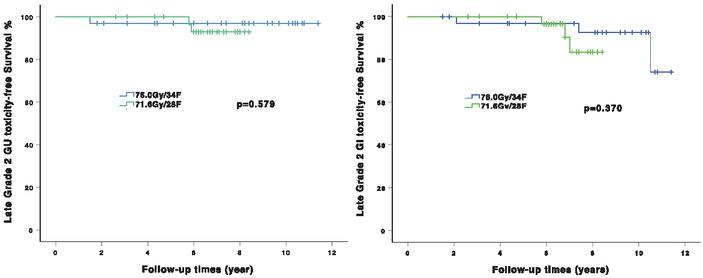 Late grade ≥ 2 genitourinary and gastrointestinal toxicity-free survival in patients received hypofractionated radiation therapy (HFRT).