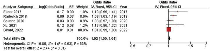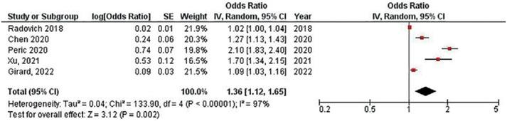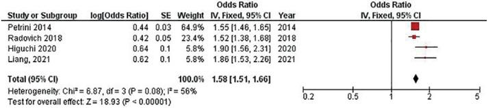 Heterogeneity was assessed using the Chisquare Q and I2 statistics. I2 presents the inconsistency between the study results and quantifies the proportion of observed dispersion that is real, i.e., due to between-study differences and not due to random error. The categorization of heterogeneity was based on the Cochrane Handbook and states that I2 < 30%, 30% to 60%, or > 60%, corresponds to low, moderate, and high heterogeneity, respectively.15 Funnel plots were used to evaluate publication bias. Forest plots were constructed for each analysis showing the Odds Ratio (box), 95% confidence interval (lines), and weight (size of box) for each trial. The overall effect size was represented by a diamond. A p-value < 0.05 was considered to be statistically significant. For graph plots (Forest and Funnel) we used Cohrain’s RevMan 5.4 version.16