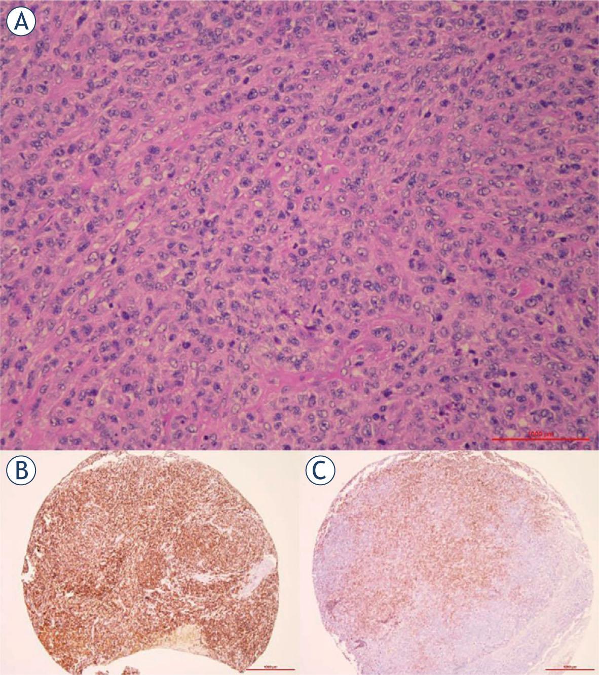 Diffuse large B-cell lymphoma (DLBCL) is the most common lymphoma, representing approximately one third of all non-Hodgkin lymphomas.2 Cases of DLBCL that do not fit the distinctive clinical presentation, tissue morphology, neoplastic cell phenotype, and/or pathogen-associated criteria of other subtypes of DLBCL are termed “DLBCL not otherwise specified (DLBCL NOS)’ and represent 80–85% of all DLBCL cases.2 The WHO 2016 classification of hematopoietic neoplasms2 requires that the neoplastic cells in DLBCL NOS be further defined based on whether they are derived from germinal centre B cells or activated B-cells as identified by gene expression profiling (GEP) or are germinal centre B cells (GBC) or non-GBC as identified by immunohistochemical (IHC) analyses. In general, DLBCL NOS is an aggressive disease with an overall long-term survival rate in patients treated with standard chemotherapy regimens of ~60%.7,8 Patients with activated B-cell (ABC) DLBCL and non-GBC variants have significantly worse prognoses than patients with the GBC variant.6 Expression of markers in DLBCL NOS neoplastic cells that have clinical significance as prognostic or predictive factors include CD5, MYC, BCL2, BCL6, CD20, CD19, CD22, CD30, PD-L1, and PD-L2.2,6 For example, 5–10% of DLBCL NOS cases express CD5 and have a very poor prognosis that is not improved by even aggressive treatment regimens, while the expression of CD30 represents a favourable prognostic indicator.2