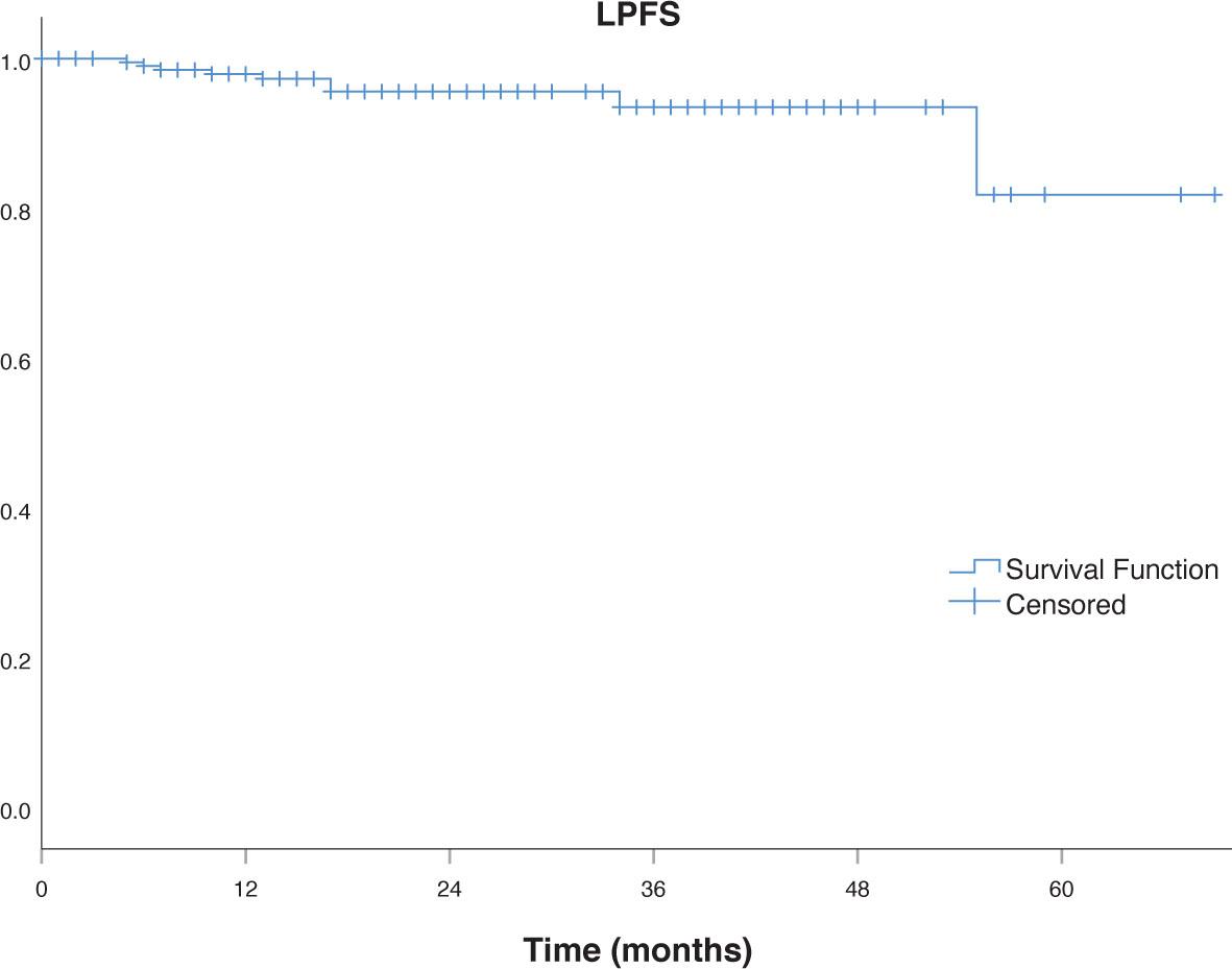 Local control rate (LCR) at 1 year was 98%, 96% at 2 and 3 years and 95% at 5 years. Local progression free survival (LPFS) at 1-year, 2-year, 3-year and 5-year were 98%, 96%, 94% and 82%, respectively (Figure 1). Interestingly, among 4 patients with small-cell lung cancer neither had local recurrence or systemic disease during the follow up period.