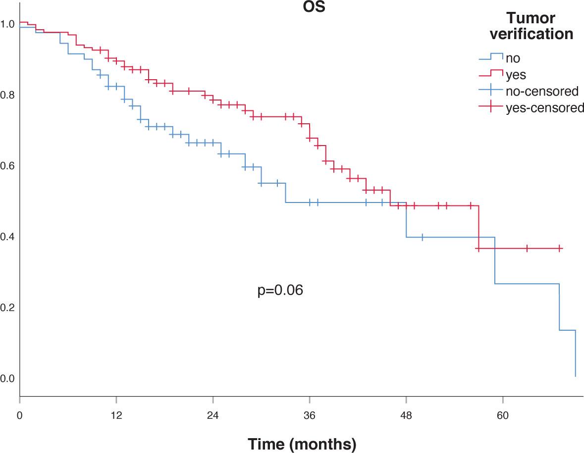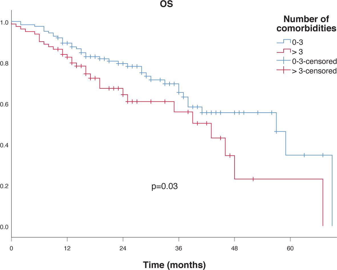 To assess the factors affecting LPFS, DFS, DMFS and OS, several clinical and dosimetric factors were studied using univariate analysis, including age, gender, tissue diagnosis, tumor location as well as mean and median PTV size, BED, PTV95 coverage, PTV99 coverage, PTV maximum dose, treatment length and treatment technique. Non-significantly better OS was seen for patients with verified tumors compared to non-verified ones (p = 0.06) as shown in Figure 2 and those with better PS (p = 0.07). The only significant difference in median OS was found between patients with 0–3 comorbidities compared to those with 4 and more, 57 months vs. 43 months as shown in Figure 3 (p = 0.03).