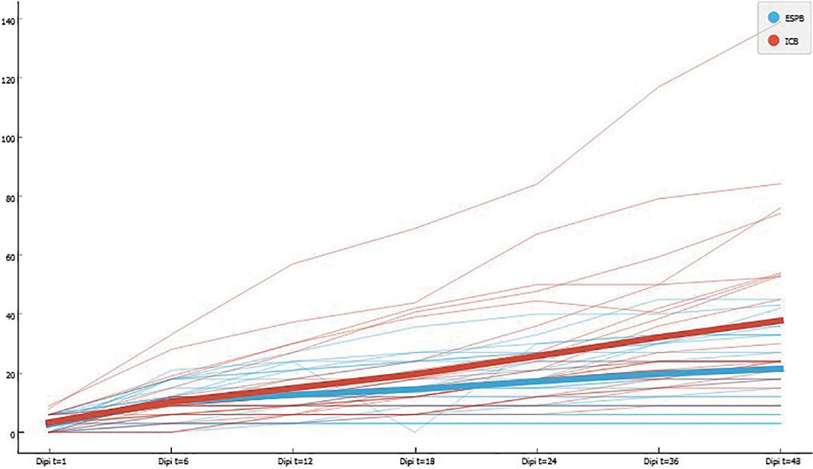 The cumulative piritramide use in the first 48 hours after surgery was 21.64 ± 14.22 mg in the ESPB group and 38.34 ± 29.91 mg in the ICNB group (p = 0.035) (Figure 3). Figure 4 shows the cumulative linear graph of piritramide use in time for each group.