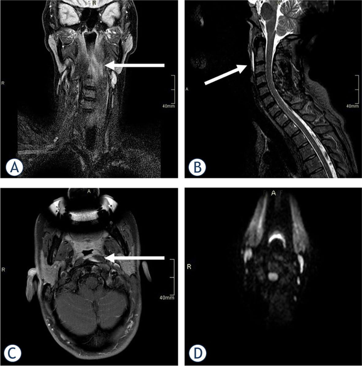 MRI in a 40-year-old female showed short tau inversion recovery sequence (STIR) hyperintensity in the upper part of her left Longus colli muscle, suggesting an oedema (A), with thin prevertebral effusion on sagittal images (B). After intravenous gadolinium contrast injection, a small area of enhancement was observed in the medial aspect of the muscle (C), but no peripherally enhancing collection to suggest an abscess was present. Diffusion-weighted imaging was normal, excluding the presence of pus (D).