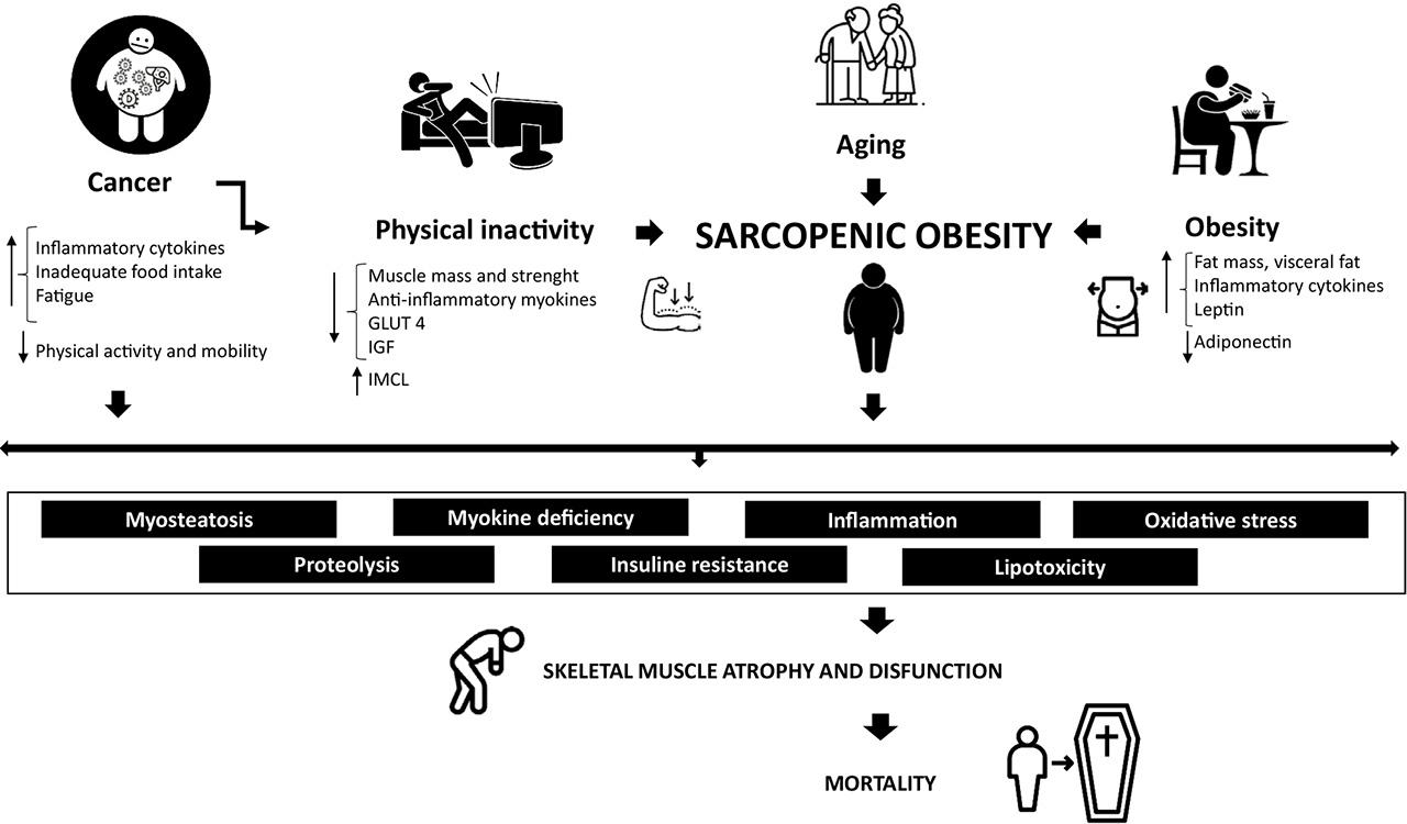 Main pathophysiological mechanisms in cancer patients with sarcopenic obesity. Body composition (low skeletal muscle mass and strength, increase in fat mass), inflammation, insulin resistance, myosteatosis, myokine dysregulation, and oxidative stress in sarcopenic obese cancer patients significantly induce muscle proteolysis, leading to muscle wasting and dysfunction and premature mortality.