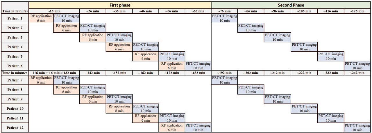 PET imaging was performed on a SIEMENS Biograph mCT® 128 system. PET imaging of the neck and chest was performed 5 and 60 minutes after i.v. injection of 100 MBq of FCh. The vial supplied by the manufacturer contains 2700 MBq FCh in the prescribed volume. The daily delivered activity typically allowed us to examine 12 patients per day, divided into two groups of 6 patients. The daily workflow and occupancy of imaging equipment for both examinations is shown in Figures 1 and 2.