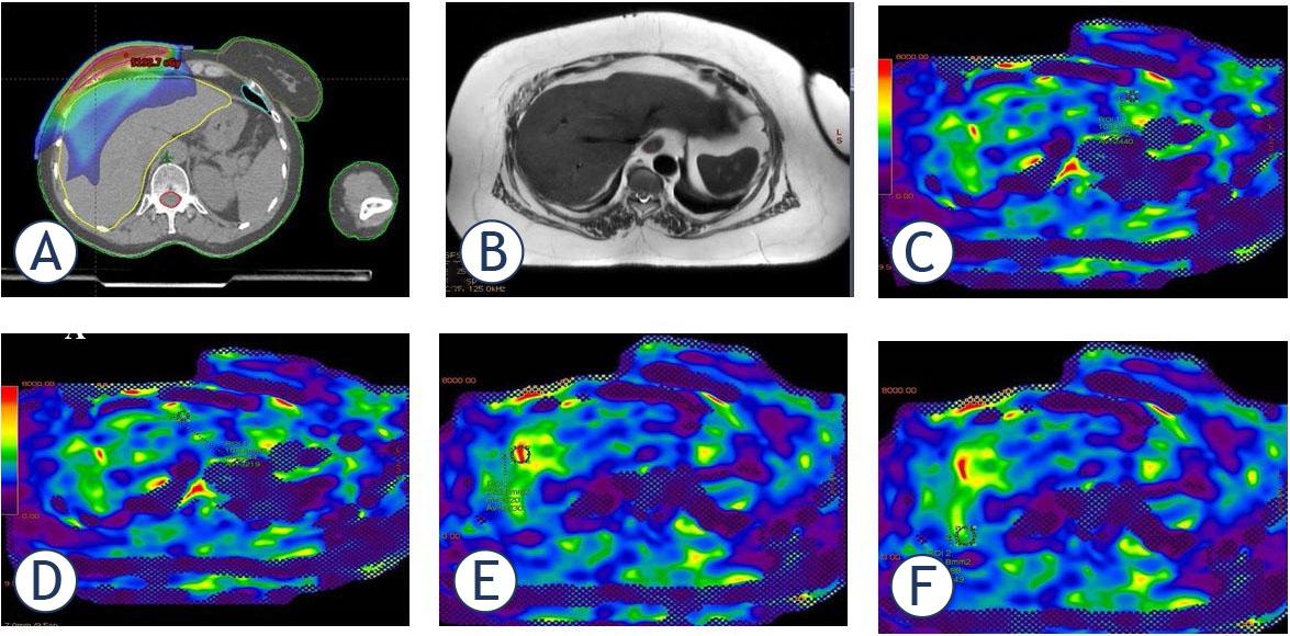 A 46-year-old female patient with a history of breast cancer and undergoing with breast-conserving surgery (BCS). (A) Liver distribution of radiotherapy (RT) dose (1000cGy) applied to breast; (B) T2 Weighted image; (C) Segment-2; (D) Segment-4A; (E) Segment-8; (F) Liver MR elastography examination from Segment-7 Elastogram measurements obtained during. When drawing the OAR, non-parenchymal structures (i.e., large vessels, bile ducts, gallbladder) that would affect the measurement were avoided. The color elastogram with a scale of 0–8 kPa shows the stiffness distribution in organs for qualitative evaluation. Orange or red regions have higher hardness values, and blue and purple regions have lower hardness values. Measured as segment-2 (3.06 Kpa), segment-4A (2.709 kPA), segment-8 (1.834 kPA), segment-7 (2.825 kPA). In the measurement made from liver segment-2, Stage 1–2 fibrosis was found. Segment-7 was normal or compatible with chronic inflammation, and the other segments were normal.