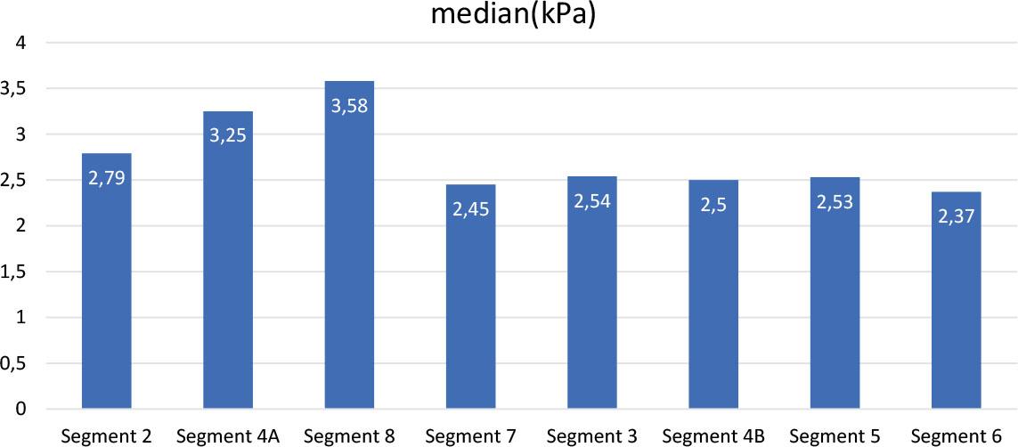 The mean kPa value for liver highest value segment-8 was 3.5 (range 2–5.79); the lowest value in segment-6 was 2.3 (range 1.42–3.01) (Figure 3). kPa stage rates and distributions in liver segments are shown in Table 4. The most frequent stage observed in segment-4A was 1 (38.2%) and 2 (58.8%), while in segment-8, the most common stage was 1 (26.4%) and 2 (41.1%). Also in Figures 1 and 2, examples of RT dose distributions and liver MRE images of two patients are shown.