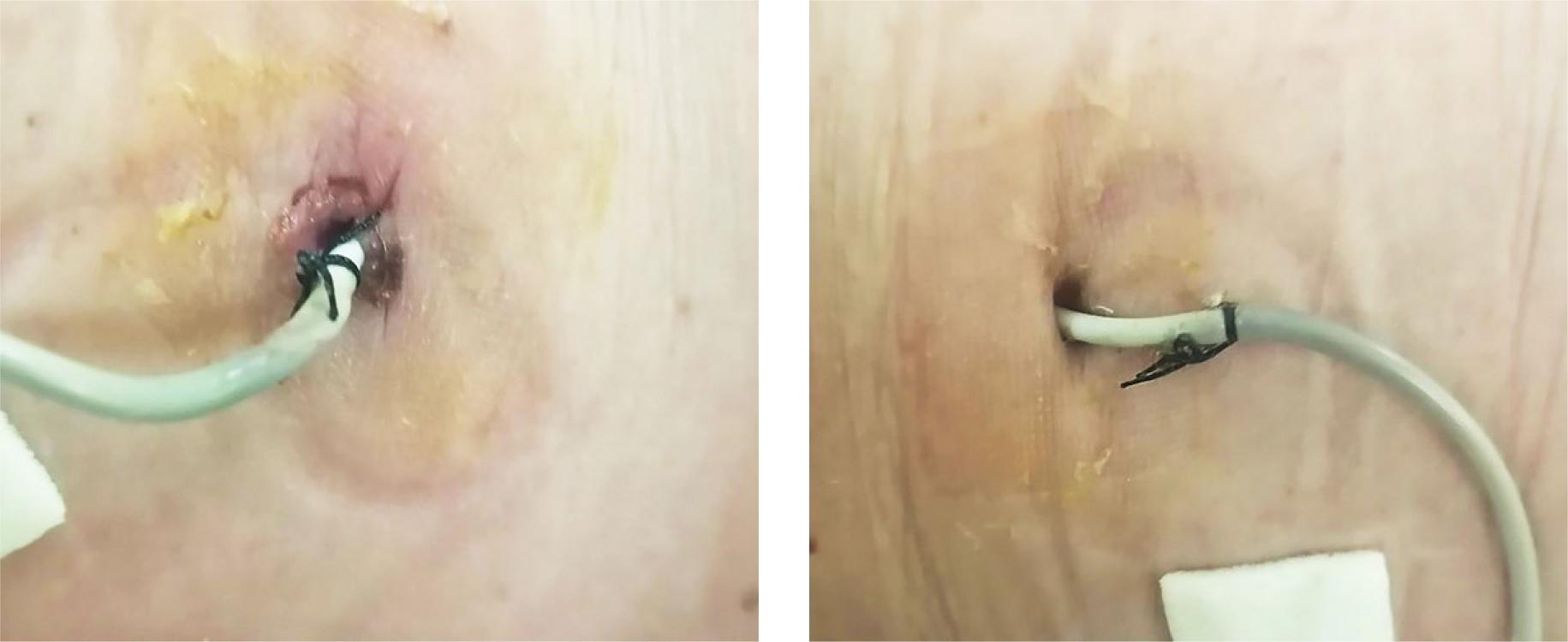 Loop percutaneous nephrostomy (PCN) catheters with strings 6 months after implantation. (A) Single suture on the left image is intact, while single suture on the other side (B) is not fixed to the skin anymore.
