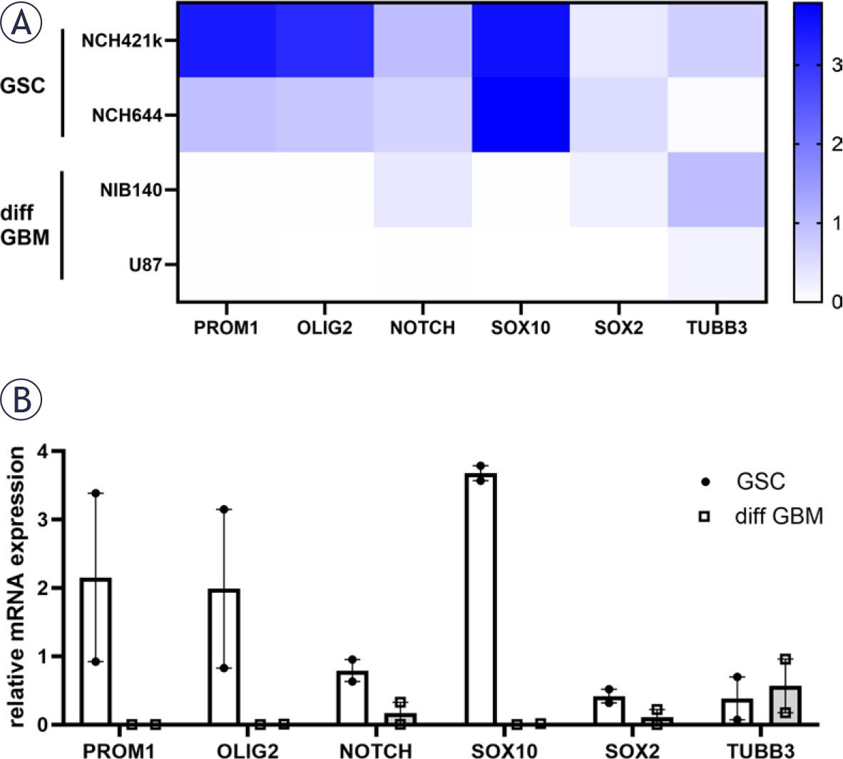 Relative mRNA expression of GSC (PROM1, OLIG2, NOTCH, SOX10, SOX2) and differentiation (TUBB3) markers in GSCs and differentiated GBM cells based on RT-qPCR analysis. (A) A heatmap of relative mRNA expression is shown for each cell lines. (B) Combined data are shown with mean values of relative mRNA expression ± SEM.