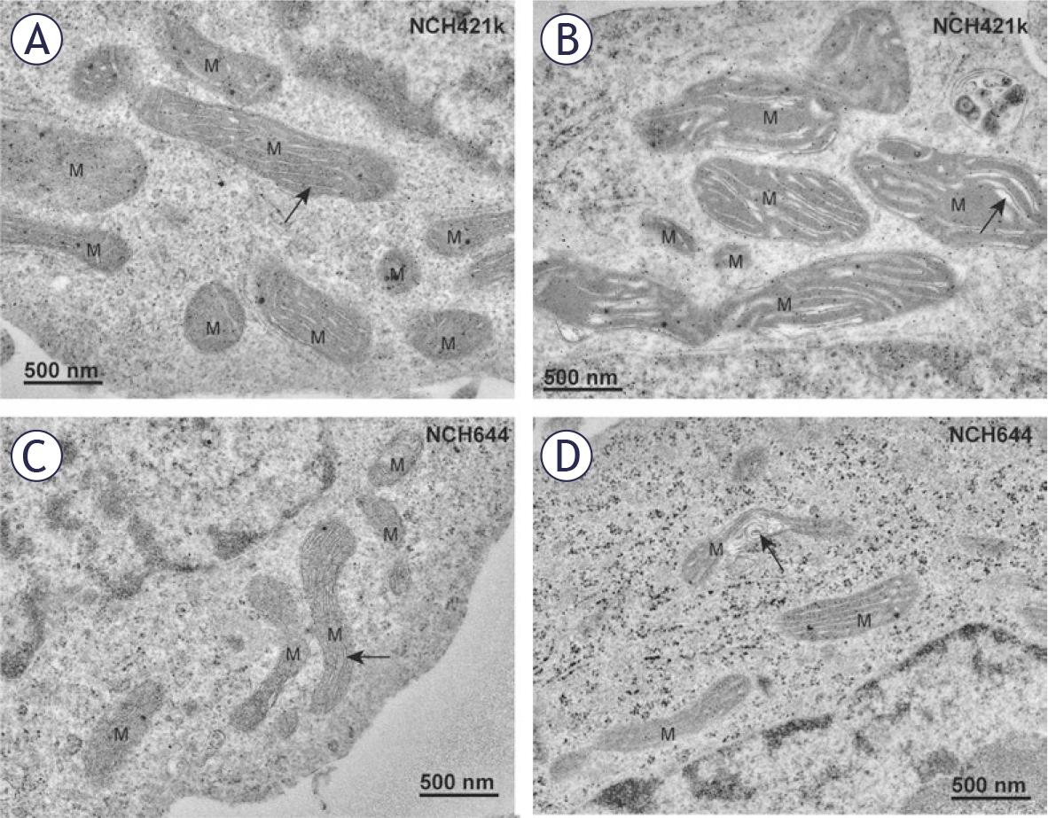 Mitochondria in GSCs have elongated mitochondria. (A) Electron-dense mitochondria (M) with narrow cristae (arrow) oriented along the longitudinal axis of mitochondria in the NCH421k glioblastoma stem-like cells (GSCs). (B) Electrondense mitochondria (M) with dilated cristae (arrow) in the NCH421k GSCs. (C) Typical electron-dense mitochondria (M) with narrow cristae (arrow) oriented along the longitudinal axis of mitochondria in the NCH644 GSCs. (D) Deformed cristae with swirled shape (arrow) in a mitochondrion of a NCH644 cells.