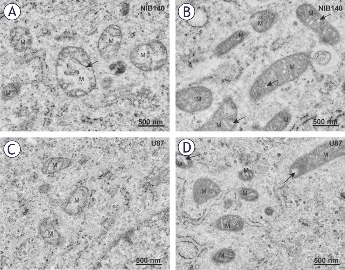 Mitochondria in differentiated GBM cells are smaller and fragmented. (A) Electron-lucent swollen mitochondria (M) with reduced cristae (arrow) in NIB140 cells. (B) Condensed electron-dense mitochondria (M) with dilated cristae (arrows) in NIB140 cells. (C) Electron-lucent swollen mitochondria (M) with reduced cristae in U87 cells. (D) Condensed electron-dense mitochondria (M) with dilated cristae (arrows) in U87 cells.