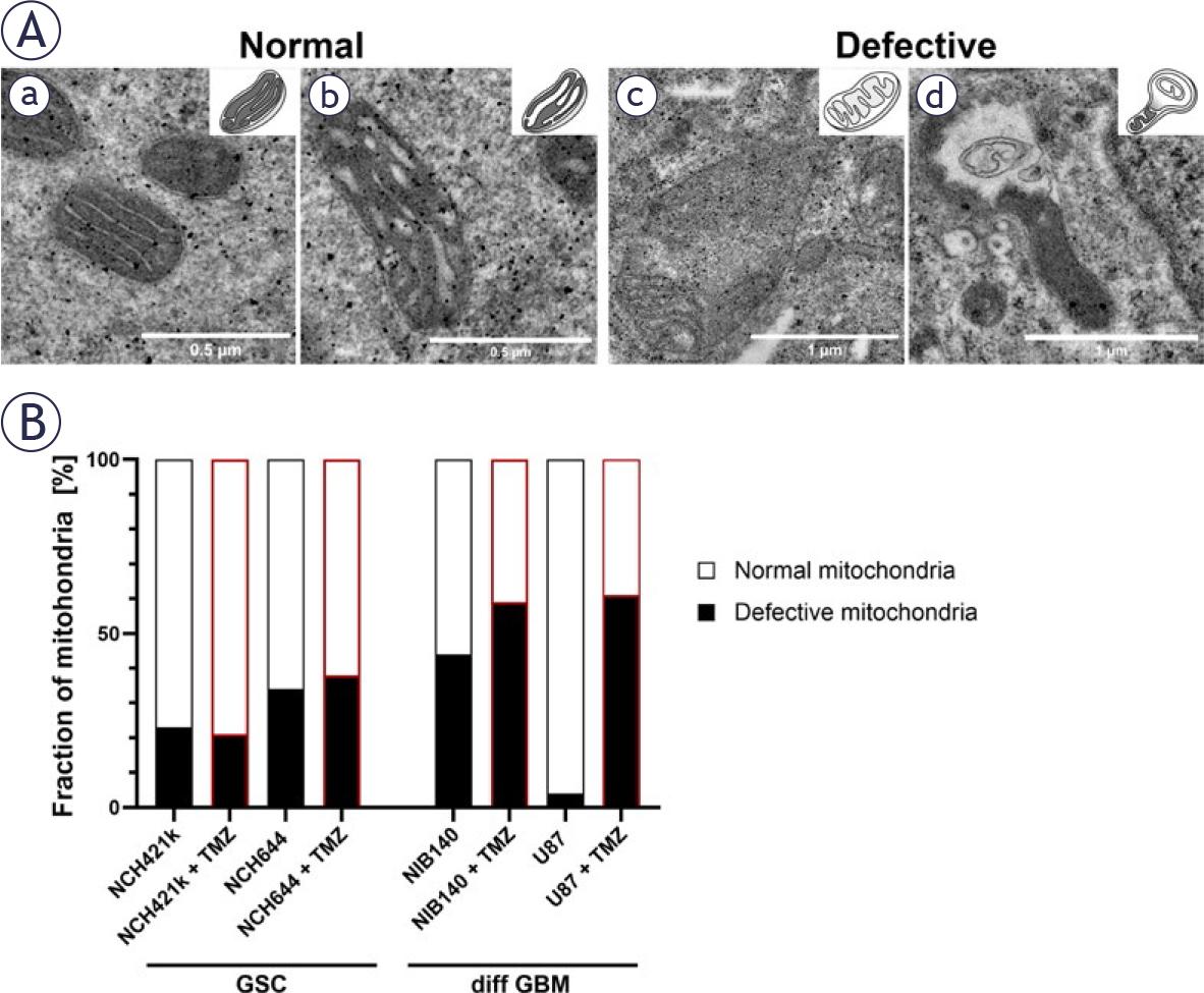 Mitochondrial ultrastructure and its quantification after exposure of cells to 100 μM TMZ. (A) Mitochondria were classified into two following types: normal and defective. Normal mitochondria are defined as mitochondria with electron-dense matrix with narrow cristae indicating metabolism with a high OXPHOS rate (a) and mitochondria with electron-dense matrix with dilated cristae indicating metabolism with a lower OXPHOS rate (b). Defective mitochondria are defined as mitochondria with electron-lucent matrix and cristae reduced in size and numbers indicating metabolism without OXPHOS (c) and mitochondria with abnormal ultrastructural alterations (swollen with membrane swirls) indicating damage and stress in mitochondria (d). (B) Quantification of the 2 categories of mitochondrial ultrastructure as fraction of all mitochondria. Experiments were performed in two independent repeats.