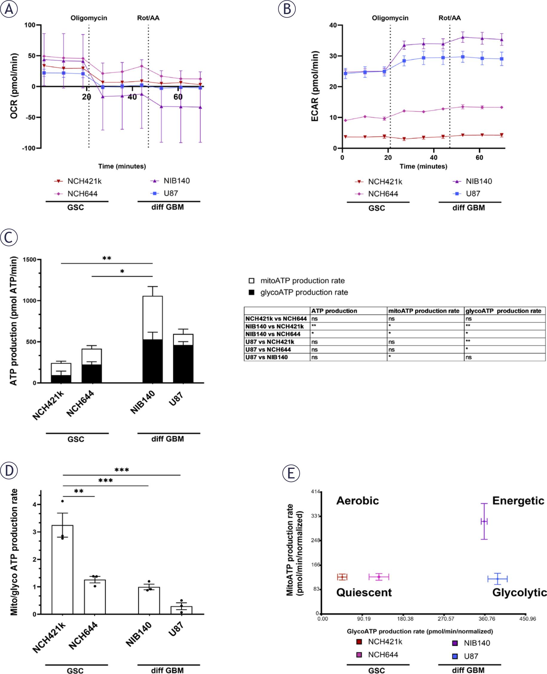 Metabolic profiles of GSCs and differentiated GBM cells as determined by extracellular flux analysis and XF Real-time ATP Rate Assay Kit (Seahorse, Agilent). (A, B) Representative kinetic graphs of oxygen consumption rate (OCR) and extracellular acidification rate (ECAR) in response to oligomycin and rotenone/antimycin A (Rot/AA) are shown. (C) Mitochondrial (mito) and glycolytic (glyco) ATP production rate in cells with respective statistics are shown in the table. Statistically significant differences in ATP production are marked directly on the graph. (D) Ratio between mito ATP and glyco ATP production rates in cells. (E) Metabolic profiles of cells that can be aerobic, energetic, quiescent and glycolytic. Values are shown as means ± SD (A, B) or SEM (C-E). Experiments were performed in 3 independent repeats (n = 3). Statistics were performed using Tukey’s multiple comparisons test.
