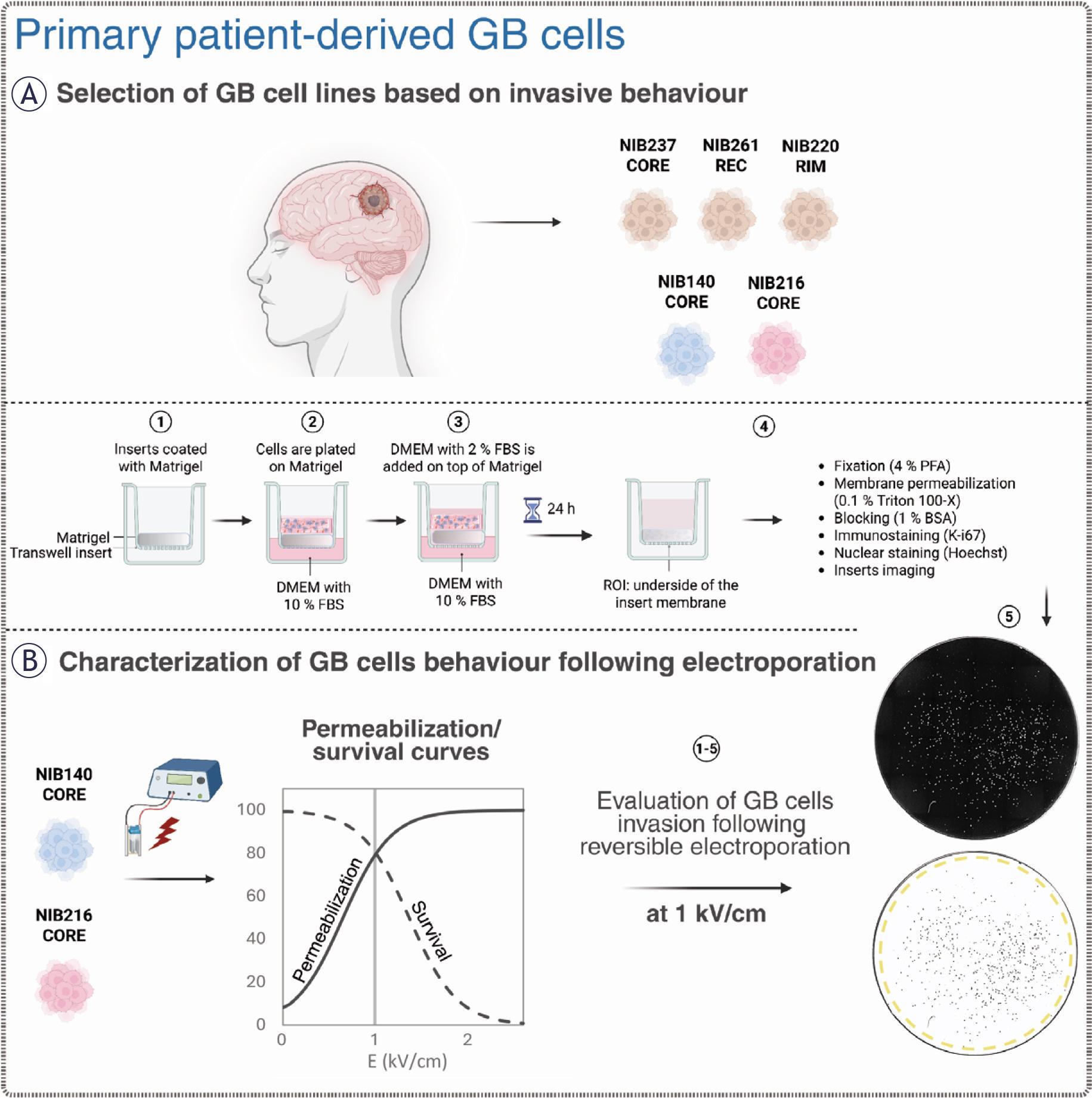 Overview of the experimental workflow for evaluating patient-derived glioblastoma (GB) cell behaviour before and after electroporation. Created with BioRender.com. (A) Five patient-derived glioblastoma cell lines, including cells from the tumour core (CORE), infiltrative rim (RIM), and a recurrent lesion (REC), were initially screened using a transwell invasion assay. Cells were plated on Matrigel-coated inserts and incubated for 24 hours. Invading cells migrating to the lower surface of the insert membrane were fixed, permeabilized, and stained with Hoechst (nuclei) and then immunostained for Ki-67 (a proliferation marker). The cells were subsequently imaged to quantify the number of invading and proliferating cells. (B) NIB140 CORE and NIB216 CORE were selected for further experiments with electroporation based on their invasive behaviour. Electric pulses of increasing electric field strength were applied to cells in electroporation cuvettes and the resulting membrane permeabilization and survival were quantified to generate characteristic response curves. Additionally, we assessed the metabolic activity of cells using MTS. Post-treatment invasion assay and fluorescence imaging was used to assess changes in invasive potential, with image analysis performed in ImageJ Fiji to quantify total and proliferating cell numbers based on nuclear segmentation and Ki-67 expression.