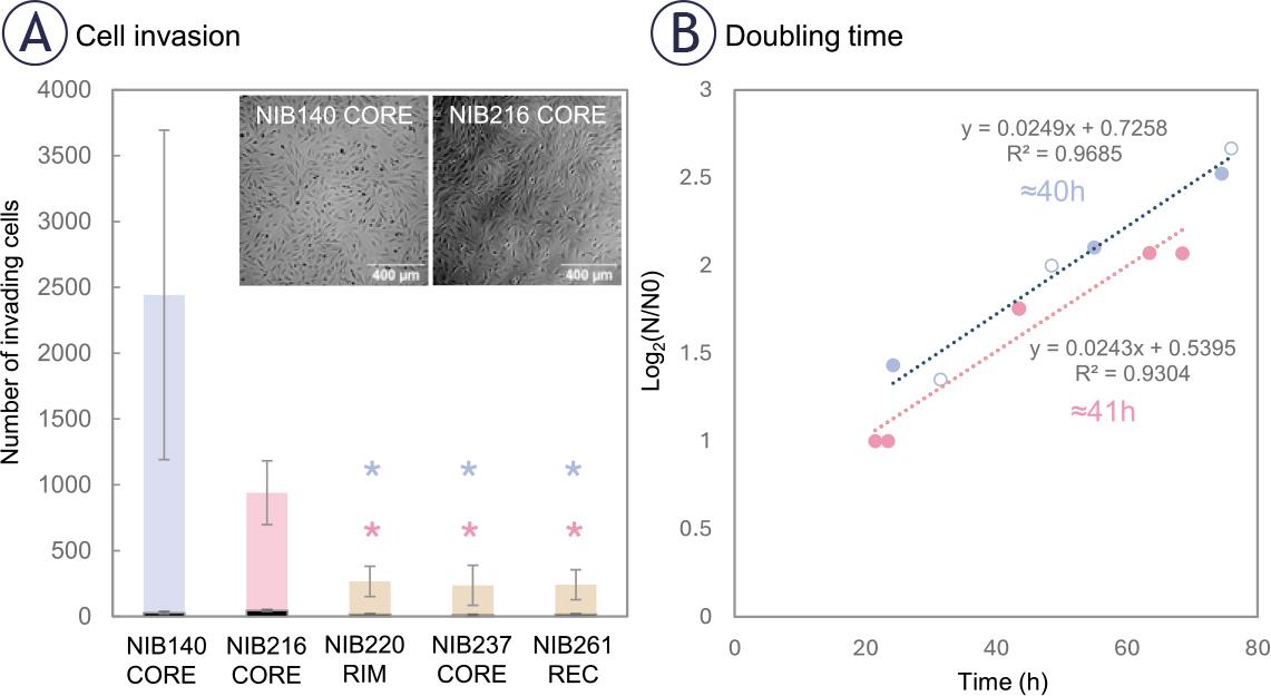 To further confirm that the observed invasion was not driven by proliferation, we measured the doubling time of each cell line. NIB140 CORE and NIB216 CORE displayed doubling times of ~40 and ~41 hours, respectively. Representative growth curves used for this estimation are shown in Figure 2B, illustrating that the 24-hour post-treatment time point falls well before either population is expected to divide. This supports the interpretation that the observed behaviour reflects actual invasion properties rather than proliferative expansion.