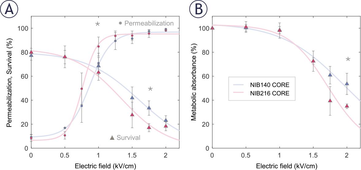 NIB216 CORE displayed somewhat greater permeabilization at intermediate electric field strength and a more pronounced decrease in viability at higher field strengths compared to NIB140 CORE, indicating greater sensitivity to electroporation-induced stress. This was further supported by MTS assay results (Figure 3B), which showed a greater reduction in metabolic activity in NIB216 CORE. Statistically significant differences (Student’s t-test) between the two cell lines were observed at 1 kV/cm for membrane permeabilization (p=0.037), 1.75 kV/cm for survival (p=0.001), and 2 kV/cm for metabolic activity (p=0.024), with significant differences indicated by asterisks (Figure 3). Nevertheless, the differences between the tested cell lines were relatively small, suggesting that similar electric field strengths can be used to treat different GB cell lines.