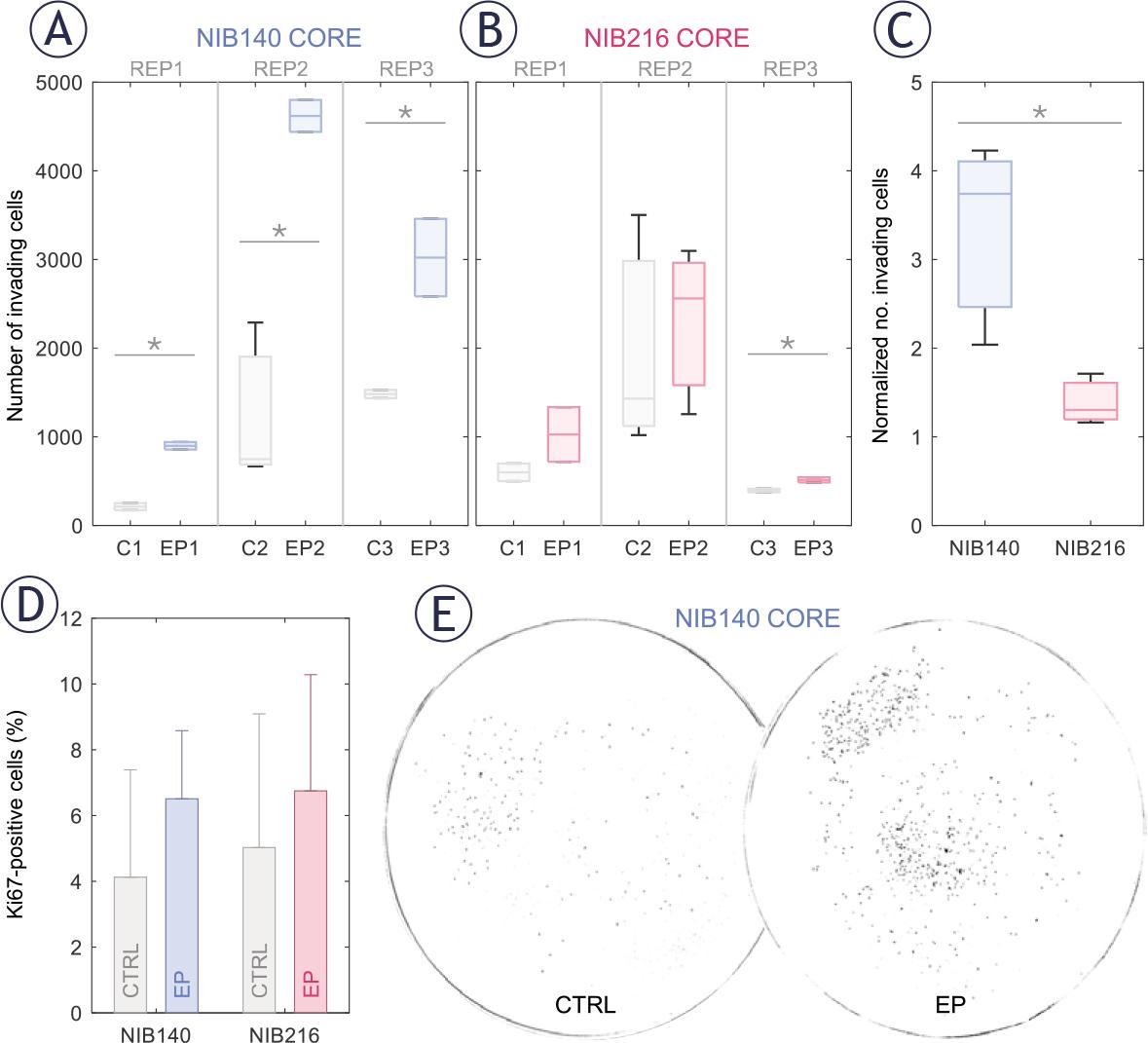 Electroporation enhanced the invasion potential of GB cells in a cell type-dependent manner, as quantified 24 hours following exposure to 1.0 kV/cm. Since the number of invading cells varied from day to day, already in control samples, we present results for each of the three biological replicates separately, with 2–3 technical replicates (transwell inserts) per one biological replicate. In NIB140 CORE, the number of invading cells was consistently and significantly higher in electroporated samples compared to sham-treated controls across all three biological replicates (Figure 4A; Student’s t-test, p < 0.05; 2–3 technical replicates per one biological replicate). In contrast, NIB216 CORE showed a more variable response, with significance reached in one biological replicate only (Figure 4B), indicating a modest and less consistent effect. We then averaged the technical replicates and normalized this averaged number of invading cells in electroporated samples to the corresponding number in sham-treated controls for each biological replicate. The obtained foldincrease in invading cells across biological replicates is presented in the box plot in Figure 4C. This analysis confirmed a consistent increase in invasion in NIB140 CORE and only modest trend in NIB216 CORE. Notably, NIB140 CORE exhibited a significantly greater 3.74-fold increase compared to just 1.30-fold in NIB216 CORE (Student’s t-test, p < 0.05), potentially reflecting intrinsic differences in these cell lines.