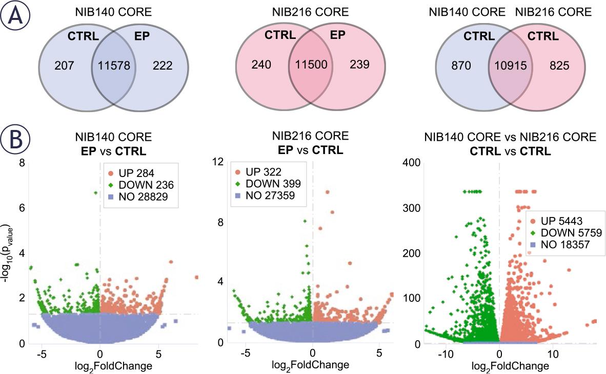 Transcriptomic differences between electroporated and shamtreated NIB140 CORE and NIB216 CORE cell lines. RNA transcriptome analysis was performed in cells harvested 24 hours after electroporation. (A) The gene expression levels analysis is presented through co-expression Venn diagrams showing the overlap in expressed genes between sham-treated (CTRL, 0 V) and electroporated (EP, 1 kV/cm) samples of each cell line, and between shamtreated NIB140 CORE and NIB216 CORE. (B) The differential gene expression analysis is presented through volcano plots. Red and green points represent significantly upregulated and downregulated genes, respectively (p < 0.05), while blue points indicate non-significant changes. Genes were classified as differentially expressed, if they met the threshold of |log2FoldChange| > 0.0.