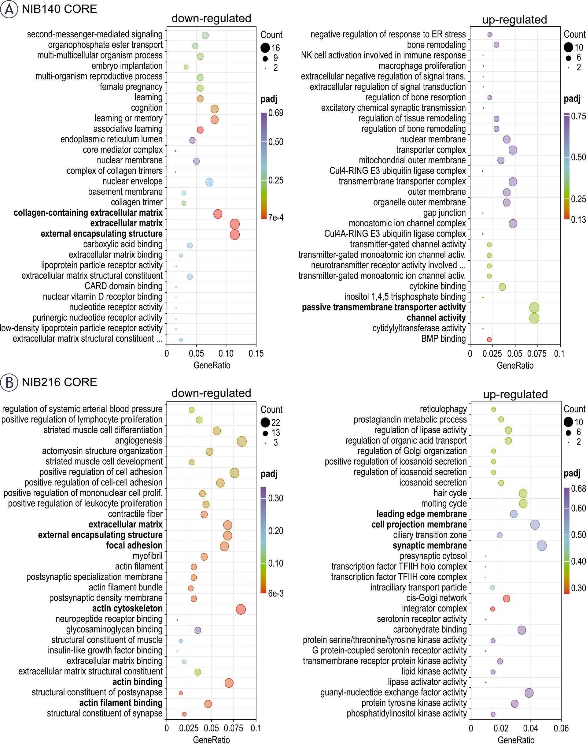 Functional enrichment analysis of differentially expressed genes following electroporation. (A) Gene ontology (GO) enrichment analysis of significantly upregulated (right) and downregulated (left) genes in NIB140 CORE cells 24 hours after electroporation. (B) GO enrichment analysis for NIB216 CORE. Dot size reflects the number of genes contributing to each GO term, while colour intensity indicates statistical significance (adjusted p-value, padj). The GeneRatio represents the proportion of differentially expressed genes associated with each GO term relative to the total number of input genes. Selected invasion-relevant categories are highlighted in bold. GO terms include biological processes, molecular functions, and cellular components.