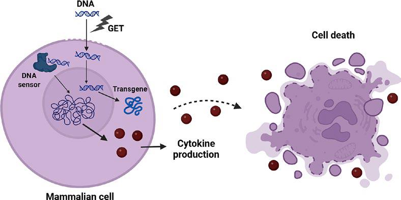 Delivery of DNA into the cells induces transgene expression as well as the activation of DNA sensing pathways, resulting in cytokine expression and cell death. Created in BioRender. Cemazar, M. (2025) https://BioRender.com/jazpf7t