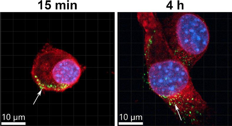 Localization of plasmid DNA after gene electrotransfer (GET) into C2C12 cell line, demonstrating DNA-membrane complexes after 15 min and internalization and presence in the cytoplasm and nucleus after 4 h. Plasma membrane is marked in red, nuclei in blue and plasmid DNA in green. Arrows represent plasmid DNA foci.
