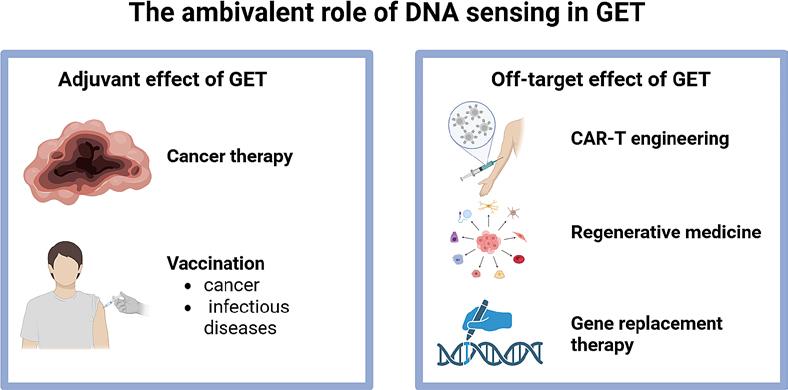 Ambivalent role of DNA sensing in plasmid DNA gene electrotransfer (GET), acting as a positive or negative ally. Created in BioRender. Cemazar, M. (2025) https://BioRender.com/zqbdsxi